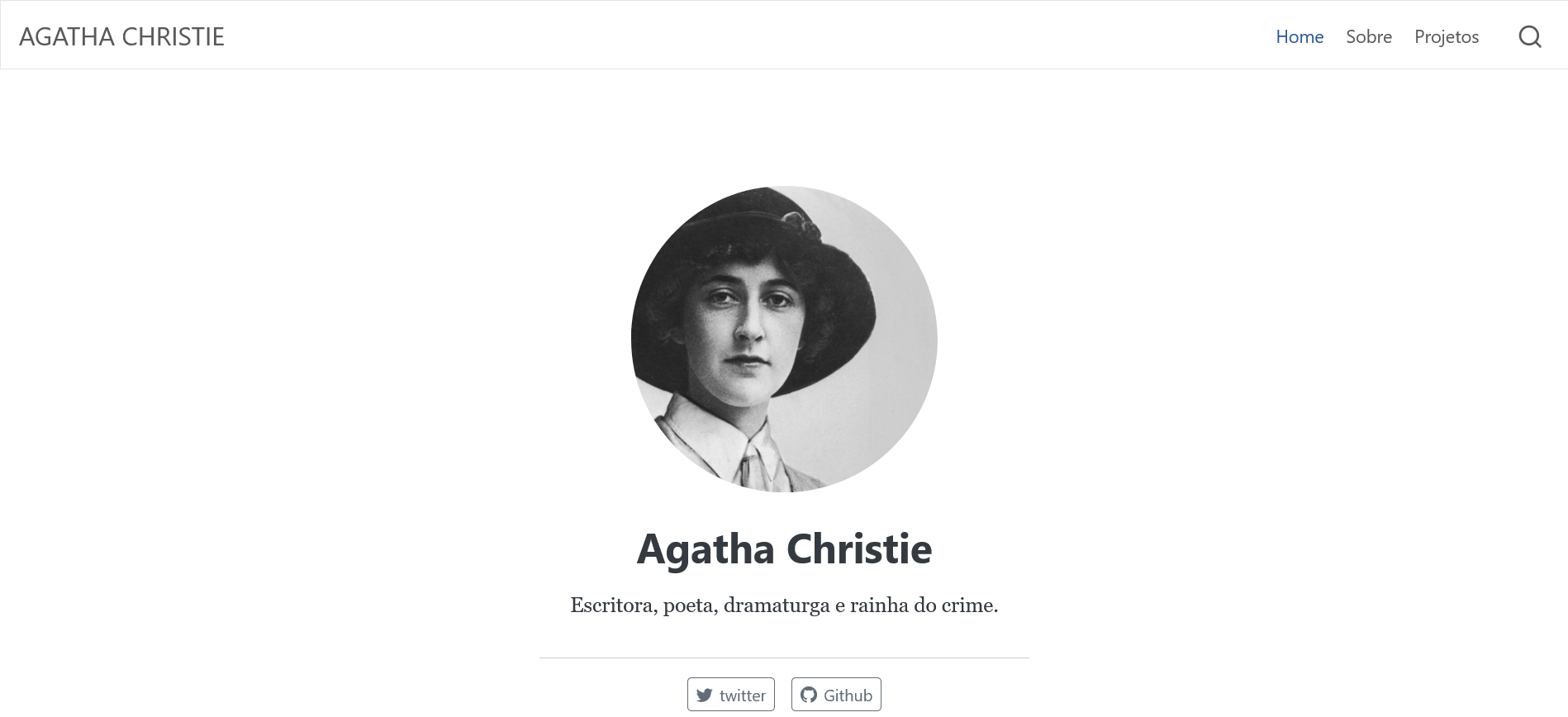 A ultima página que nos falta criar é a página inicial. Iremos combinar as funções about e listing apresentadas acima para criar uma página com uma breve introdução que quando clicada nos redireciona para a pagina sobre, e uma pequena seção com os últimos 3 projetos publicados.